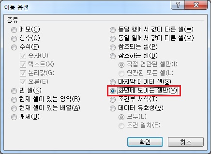 화면에 보이는 셀만 복사하기 위해서는 선택 영역을 지정한 후(순서 중요!) 리본 메뉴에서 홈 -> 찾기 및 선택 -> 이동 옵션 메뉴를 실행한 후 [화면에 보이는 셀만] 옵션을 선택합니다.