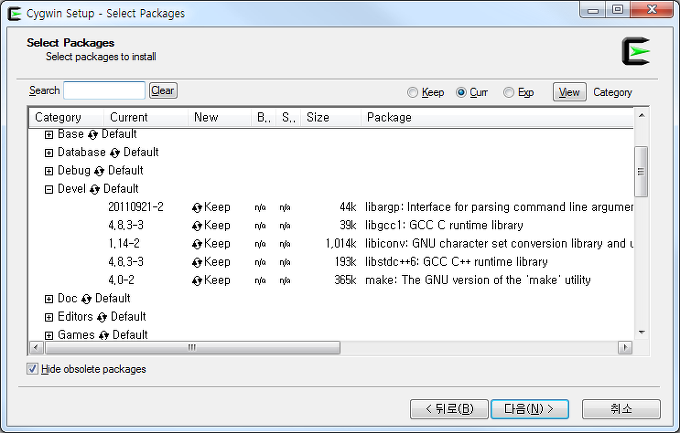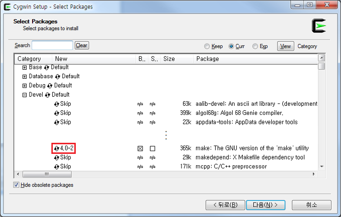 - setup-x86.exe (혹은 setup-x86_64.exe)를 실행하여 설치를 진행한다. 설치 과정 중 나머지는 default로 하여도 무방하나, 패키지 선택시 Devel 항목 밑에 make 패키지 옆에 Skip을 눌러 최신 버전이 표시되어 해당 패키지가 설치되도록 한다.