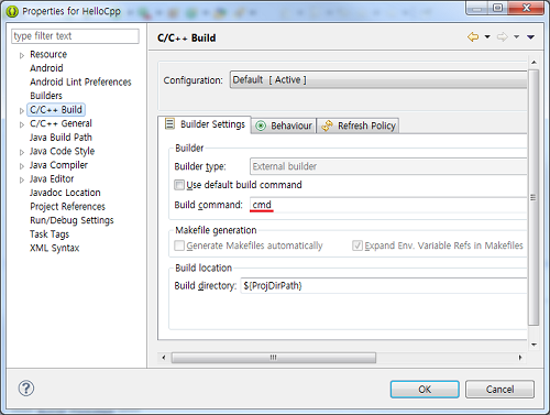 3) HellopCpp 프로젝트의 속성을 열고, C/C++ Build 항목을 선택하고, build command의 내용을 cmd로 바꿔준다.