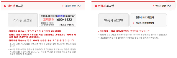 3. ex card 서비스 화면이 나타나는데, 로그인을 안하고 진행하면 화면이 닫히므로 로그인을 한 후 진행합니다. 로그인은 아이핀과 인증서 로그인이 가능합니다.